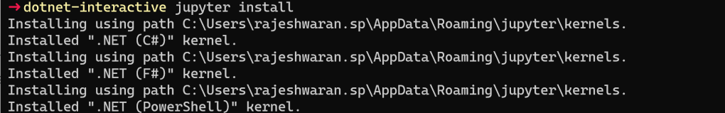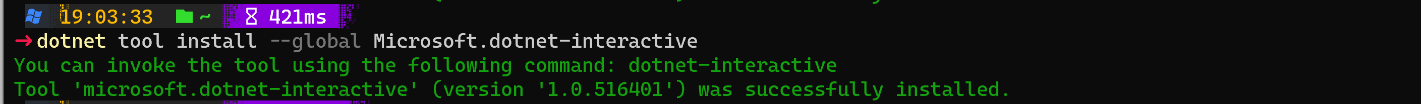 Next, open up a terminal window and run the command below to install dotnet-interactive. You will receive a successfully installed message.